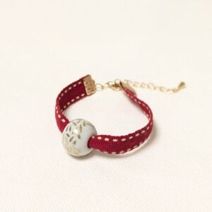 Ce bracelet avec perle en Porcelaine et ruban personnalisables, fermé par un fermoir en laiton doré avec chainette réglable. Un bijou artisanal, féminin et facile à porter, conçu pour durer.